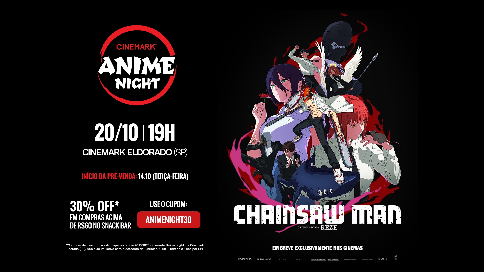 Os fãs de Denji, o Homem-Motosserra, terão uma experiência especial com o cinema decorado com referências do anime. Essa é uma oportunidade única de conferir a produção antes de todo mundo, no melhor conforto e qualidade de tela que uma sala da Cinemark oferece. Quem estiver presente poderá aproveitar ainda o cupom “ANIMENIGHT30”, exclusivo do evento, que concede 30% de desconto em compras acima de R$ 60 no Snack Bar.
