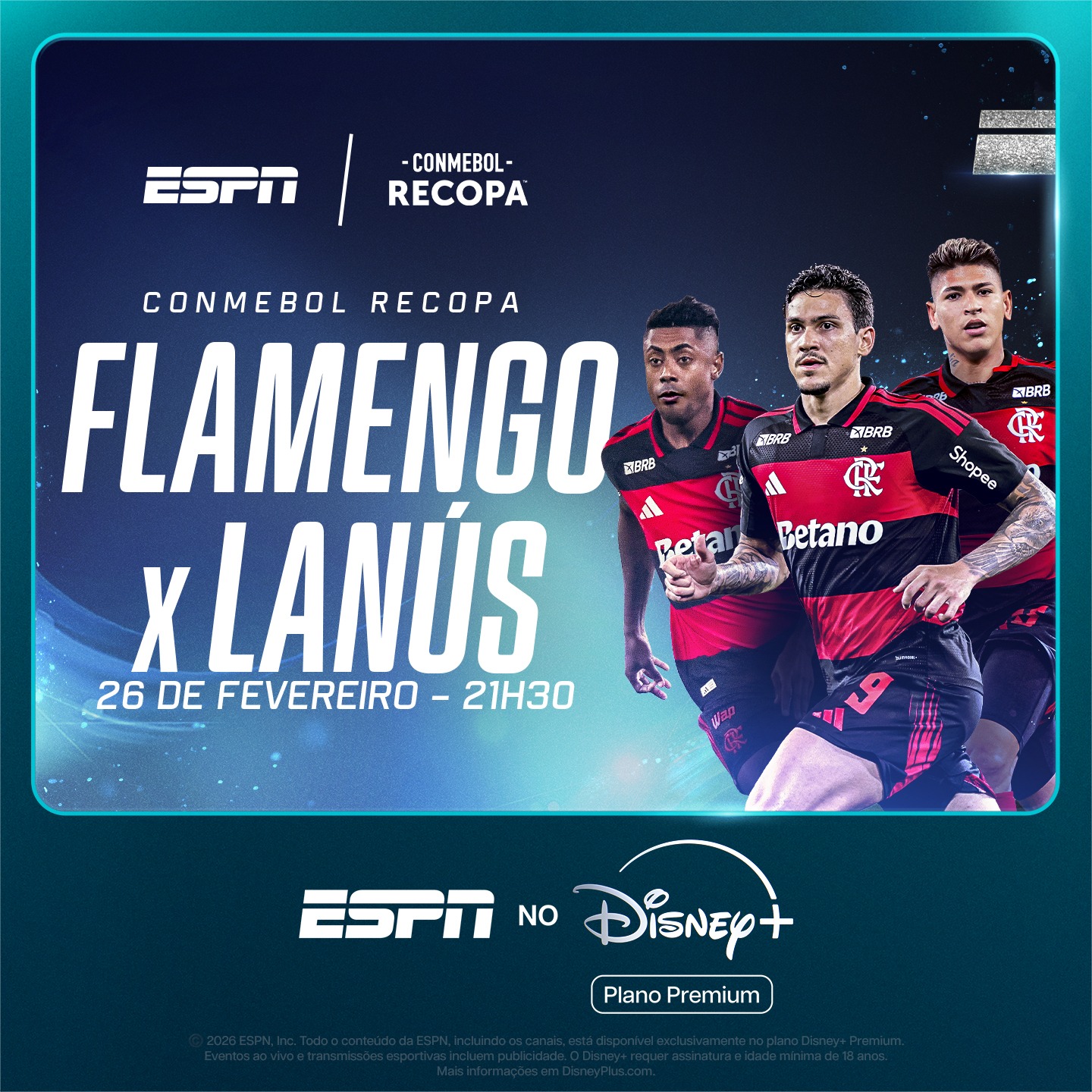 A ESPN e o Disney+ Premium exibirão nesta quinta-feira (26) às 21h30, com exclusividade, o duelo entre Flamengo e Lanús, da Argentina, pela decisão da Recopa. Para acompanhar a partida, a emissora preparou uma ampla cobertura diretamente do Maracanã.
