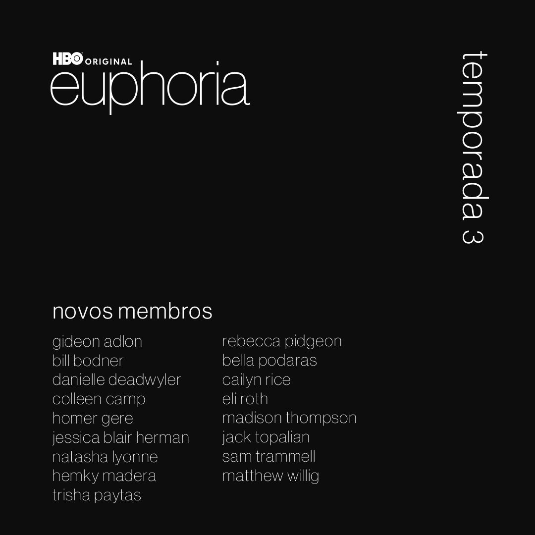 São Paulo, 17 de outubro de 2025 – A HBO revelou os novos nomes que se juntam ao elenco da aguardada terceira temporada de EUPHORIA, série original de drama vencedora do Emmy® e criada por Sam Levinson. Farão parte da nova temporada Natasha Lyonne, Eli Roth, Gideon Adlon, Bill Bodner, Colleen Camp, Homer Gere, Jessica Blair Herman, Hemky Madera, Trisha Paytas, Rebecca Pidgeon, Bella Podaras, Cailyn Rice, Madison Thompson, Jack Topalian, Sam Trammell, Matthew Willig, Danielle Deadwyler e Kwame Patterson.  Além deles, Dominic Fike, Nika King, Melvin “Bonez” Estes, Daeg Ferch, Paula Marshall, Zak Steiner, Alanna Ubach e Sophia Rose Wilson estão de volta à série, prevista para estrear no segundo trimestre de 2026