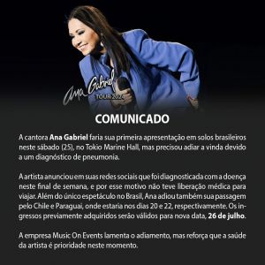 A cantora Ana Gabriel faria sua primeira apresentação em solos brasileiros neste sábado (25), no Tokio Marine Hall, mas precisou adiar a vinda devido a um diagnóstico de pneumonia.