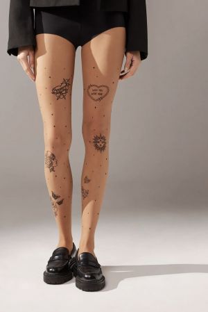 Calzedonia – Meia-Calça Transparente Fio 20 Efeito Tatuagem Old School – Bege – R$ 94