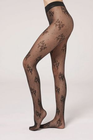 Calzedonia – Meia-Calça Em Tule Com Flores e Poás Fio 40 – Preto – R$94,00